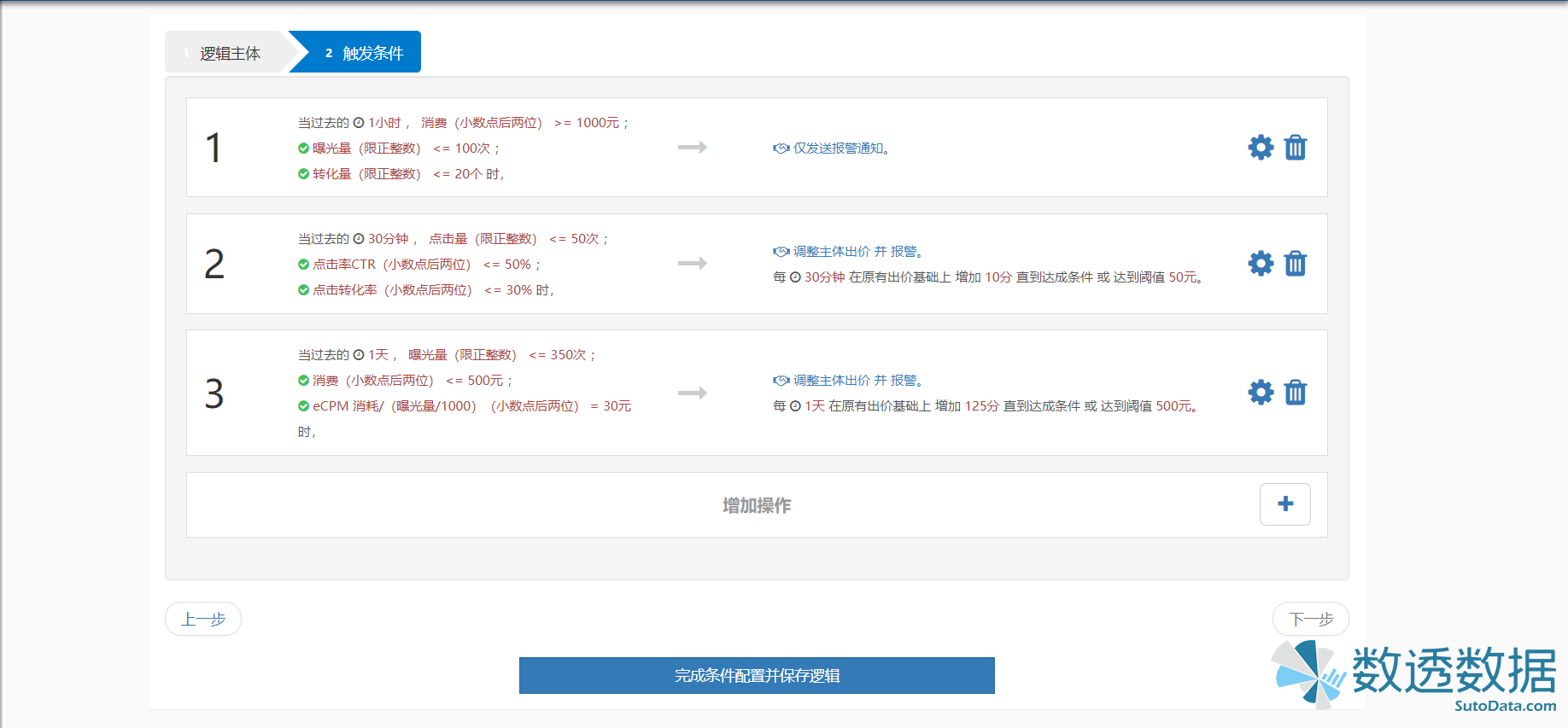 数透数据监控的作用是通过设定的规则条件当账户或者投放组或计划出现异于规定条件时,第一时间发短信和微信消息推送给操作人员。可以设置多种规则,如CPC1.6元(单个规则)、花费50000元且CPC1.9元(多个规则),进行自动监控。开启功能后,当设定条件发生变化时,系统根据提前设置的条件进行发送预警通知或进行修改出价等操作。