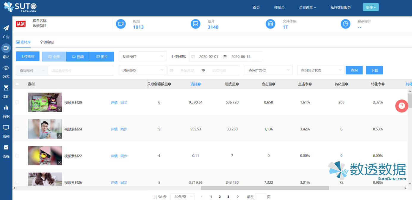 素材库解决素材的资源管理和复用问题。统一的素材管理,可以实现跨平台+跨账户的素材上传使用,极大的提高素材上传的效率。此外,在素材库列表界面可以看到所有素材的投放数据,包括展现、花费、点击、转化数、ROI等。便于广告主对已投放的素材进行分析,为新素材提供指导方向。同时也能对脚本制作,拍摄,后期人员的绩效评估,提供数据参考依据。
