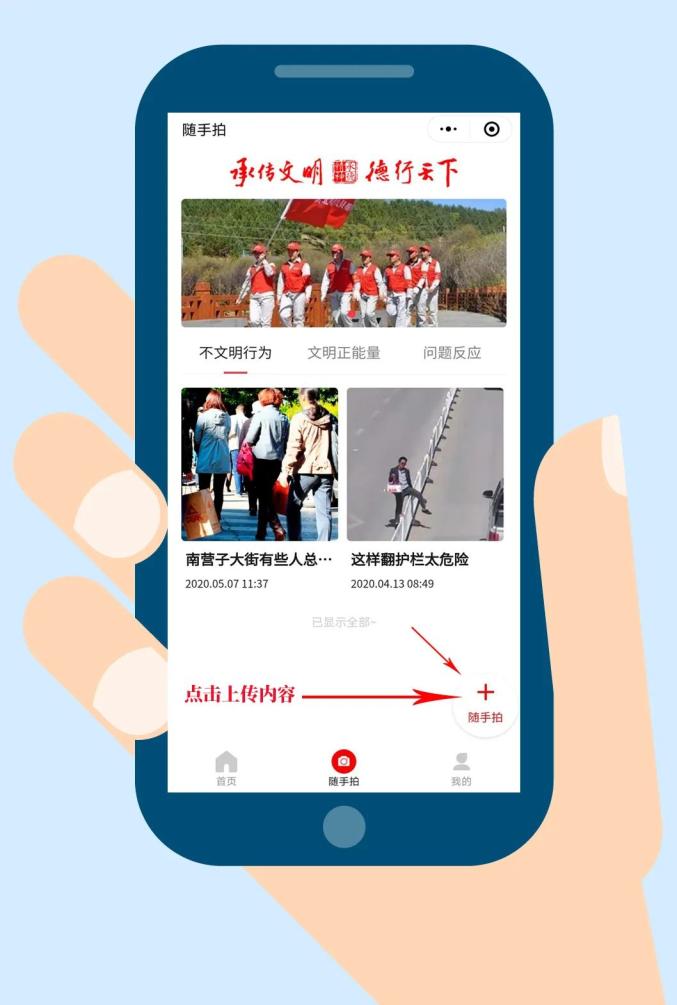 3.随手拍内容发布:点击小程序首页下方中间的菜单“随手拍”,即可进入随手拍页面。主页设置:不文明行为、文明正能量、问题反映三个栏目。