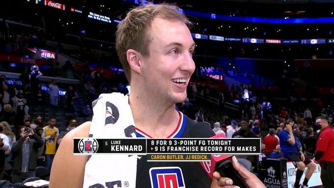 此役,快船后卫肯纳德手感火热,他替补出战22分钟,11投8中,三分9投8中,得到25分3助攻2抢断的数据。