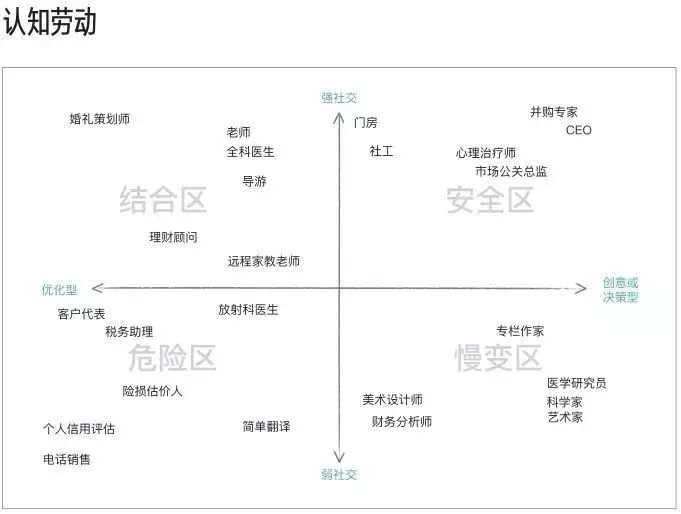 同样的,我们要对认知劳动中的优化型进行了解,如果认知劳动的重点是将数据中可量化的变量最大化,就归类为“优化型”的职业,比如个人信用评估员,他们只需将客户最近的商业行为罗列出来,根据信用评估表一一对应,最终得出信用评分就可以了,所以看出他们所做的工作得出的结果都是可以量化的。而人工智能就是一个善于数据分析将结果量化的一个“行家”。