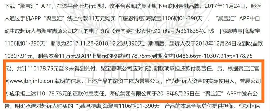 据了解,海航集团多次通过邮件推介上述理财产品。该邮件称,海航集团下属企业在聚宝匯发行产品,资金募集后投向集团内资产优良的项目,并称鼓励员工支持集团发展,分享企业成长,提高员工闲置资金的收益率。