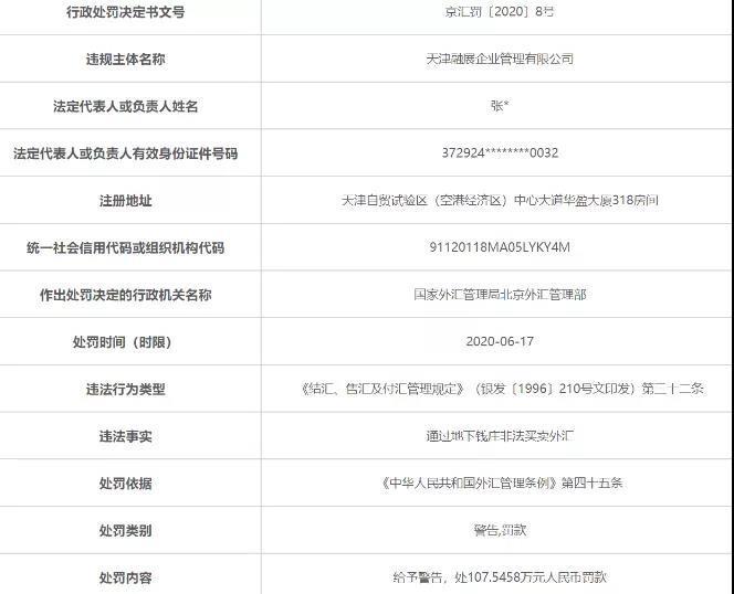 近日,天津融展企业管理有限公司(下称“天津融展”)因“通过地下钱庄非法买卖外汇”,被国家外汇管理局北京外汇管理部给予警告,并处107.54万元罚款。