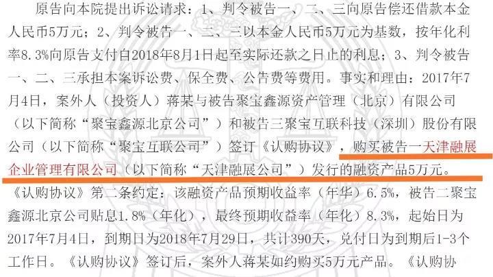 原告在诉讼请求中称,2017年7月4日,投资人与被告聚宝鑫源资产管理(北京)有限公司、被告三聚宝互联科技(深圳)股份有限公司签订《认购协议》,购买天津融展发行的融资产品5万元。在到期日2018年7月29日逾期未兑付本金,要求被告返还本金并支付逾期利息。