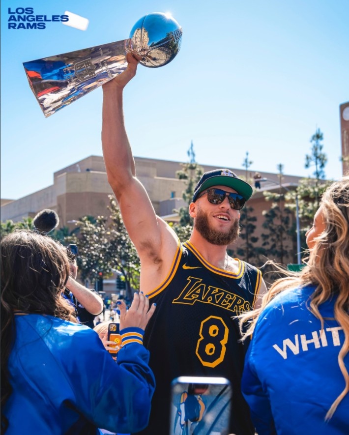 2月17日讯 NFL洛杉矶公羊队于今日进行夺冠后的游行庆典活动,超级碗MVP卡普身穿科比8号球衣现身。
