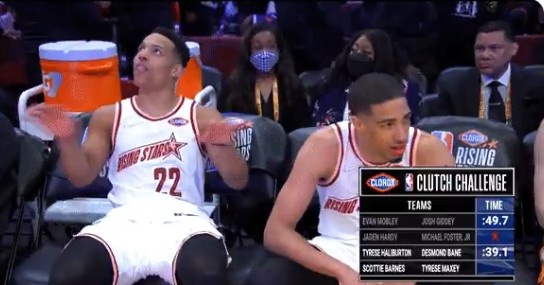 贝恩和哈利伯顿表现出色,两人用时39.1秒就完成了比赛。当贝恩坐在板凳席时,他模仿了卡特(曾在灰熊效力)在2000年扣篮大赛完成扣篮后的经典庆祝动作——It's over。