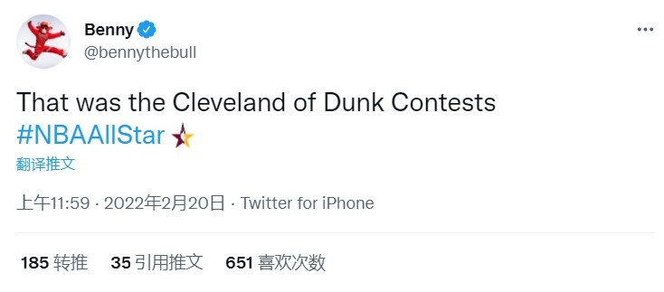 公牛吉祥物本尼的官方推特赛后吐槽说:“这(次扣篮大赛)就是扣篮大赛里的克利夫兰。”