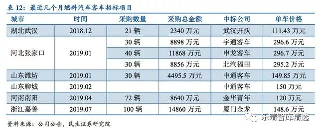 根据采购中标情况推算,目前氢燃料电池客车的单价在约150-300万左右,按1500辆年销量推算,目前燃料电池车市场规模在20-50亿元之间。