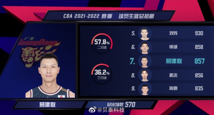 全场比赛,易建联得到26分8篮板2抢断,生涯总抢断数来到857次,超越孟达升至CBA历史第7位。