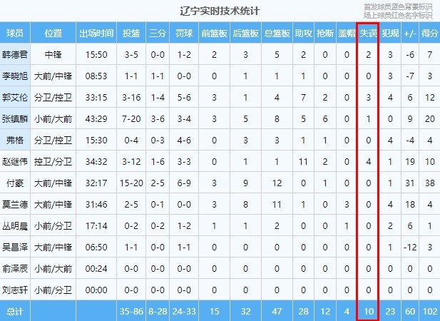 反观辽宁,他们今晚只有10次失误,其中赵继伟4次。