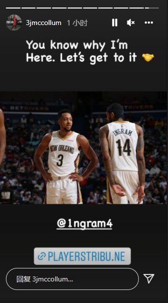 2月12日讯 鹈鹕新援CJ-麦科勒姆今日在其个人社媒@英格拉姆,向其表达了对于在新球队达成目标的决心。