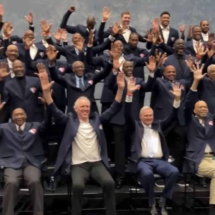 2月21日讯全明星正赛将在今天打响,赛前多位球星和NBA名宿一起进行了拍照活动。