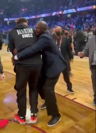 而乔丹突然从一旁跑出来紧紧抱住东契奇,随后与他握手相谈甚欢!