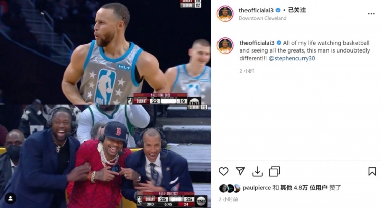 赛后,艾弗森在IG上发了这张照片并写到:“我见证过太多伟大,但这个男人是独一无二的!@库里”