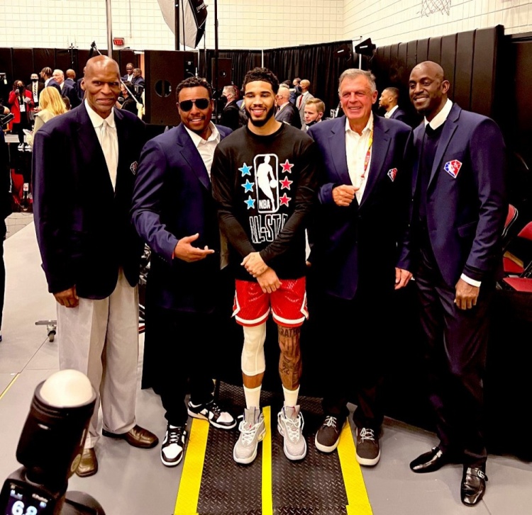 2月22日讯 昨日全明星正赛前,塔图姆同凯尔特人名宿帕里什、皮尔斯、麦克海尔以及加内特一起合影。