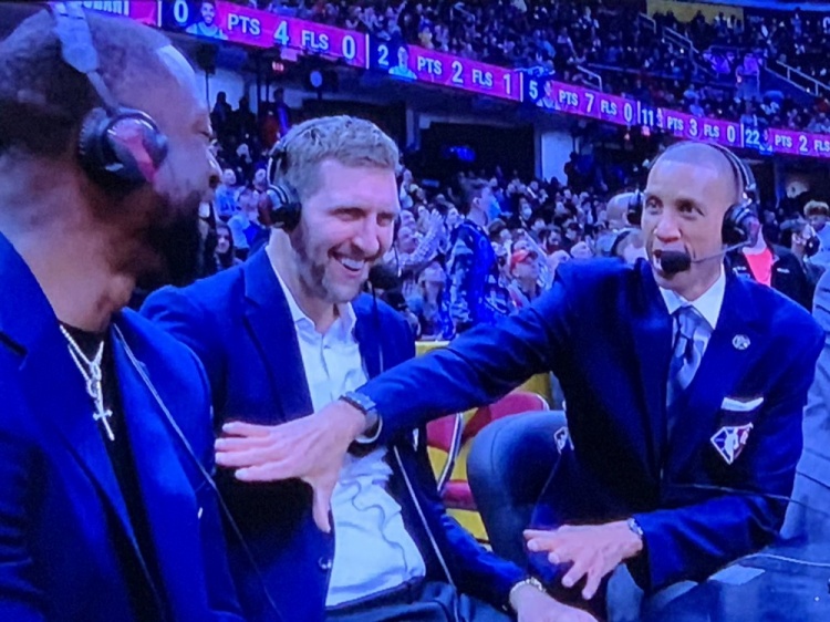 2月21日讯在今天的全明星正赛转播期间,韦德与诺维茨基这两位老对手以嘉宾的身份坐到了解说席。