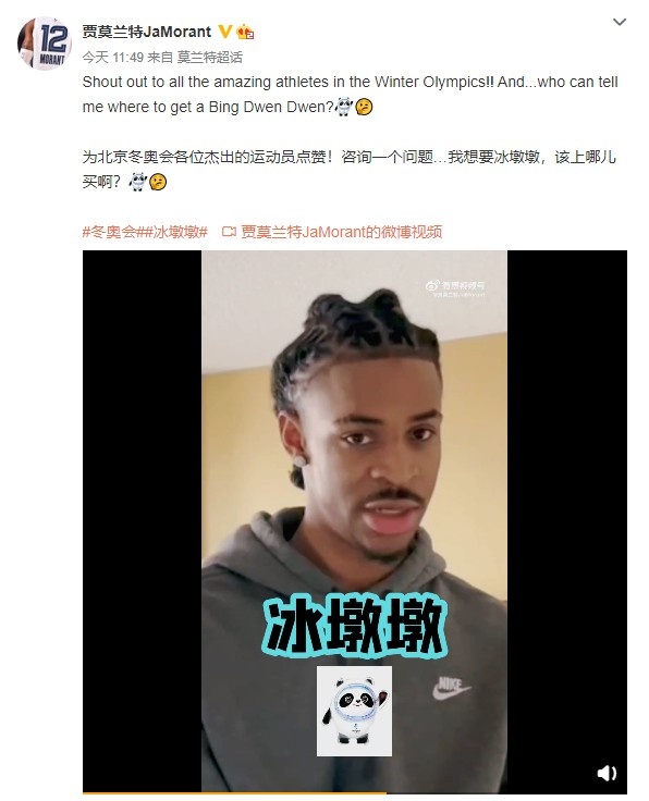 2月22日讯 灰熊球星莫兰特今日在个人微博晒出一则视频,向广大中国网友咨询如何购买近日大火的冬奥会吉祥物冰墩墩。