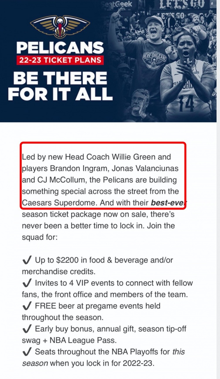 2月22日讯 今天鹈鹕官方发布了一则给22-23赛季季票持有者的通报。