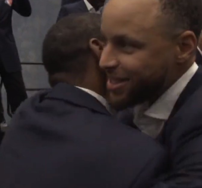 NBA官方今日晒出了合影期间的一些花絮,活塞名宿微笑刺客伊赛亚-托马斯与库里拥抱,并对他说:“欢迎加入我们,baby。”