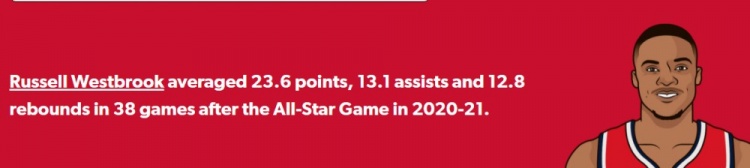 上赛季为奇才效力的威少,在全明星赛后的38场比赛里,场均可以得到23.6分12.8板13.1助,并带领奇才杀入了附加赛。
