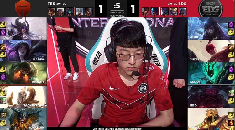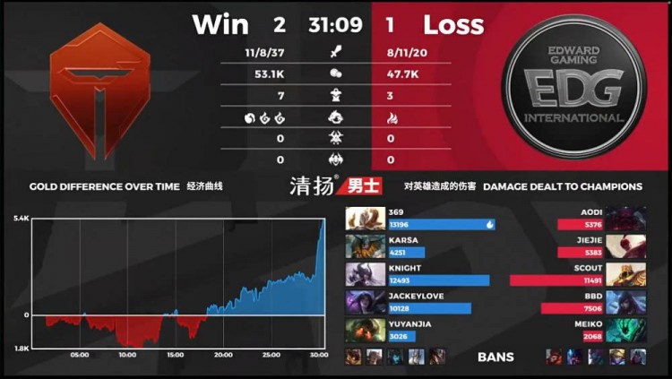 【19:35】EDG中上入侵TES野区,没想到雷克赛听到EDG人员位置,TES迅速集结五人来团,EDG只能撤退,TES完成1换2。