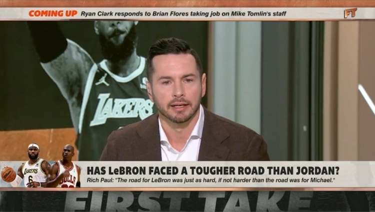 “我们说科比是乔丹和詹姆斯之间的一个过渡桥梁,但是詹姆斯超越了人们对他的不同程度的期待。乔丹把这个标准设得太高了,而詹姆斯至少达到了乔丹的标准(reached the bar),我不是说乔丹的生涯之路不比詹姆斯难。詹姆斯一直在说的是,他要去追赶乔丹,他做到了。”