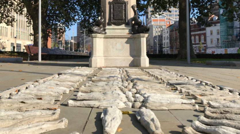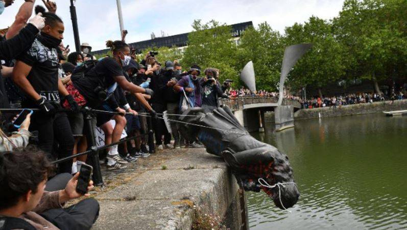 在英国布里斯托的雕像早已被示威者推倒。人们将爱德华·科尔斯顿的雕像牢牢绑住,一同将它推向了布里斯托港口的河道处,就像处理一具尸体那样。