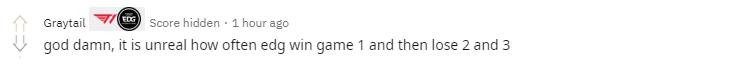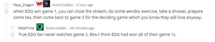 当EDG赢下第一局之后,你可以关掉直播,做点有氧运动,冲个凉,喝点茶,然后回来看第三局决胜局,虽然你知道他们还是会输掉比赛。