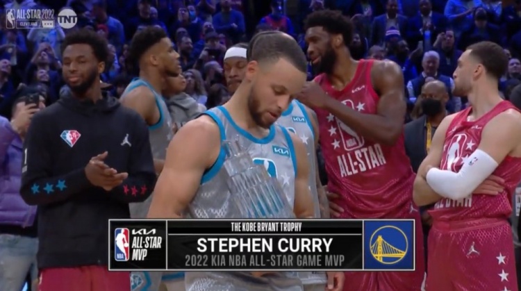 谈到收获全明星赛MVP,库里说道:“这个经历很特殊,回到俄亥俄州,和联盟里最棒的球员们一起打球。这个奖杯意义特殊,纪念科比、Gigi以及两年前遇难的所有人,我很谦卑,也很幸运。我很感激得到这个奖。”