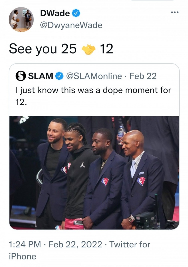 2月23日讯 今日热火名宿韦德在转发了全明星赛上与库里、莫兰特、雷-阿伦的合照。