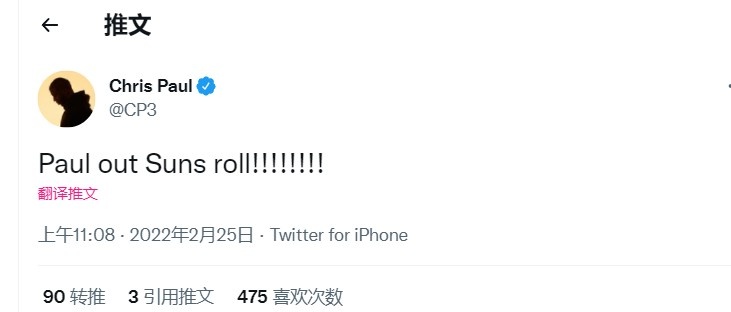 此役因伤缺战的太阳球星保罗赛后发推庆祝球队继续连胜,他写道:“保罗不在,太阳继续连胜!!!!”