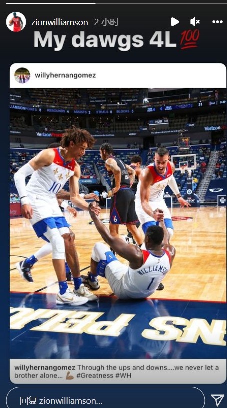 2月25日讯 鹈鹕新星锡安-威廉森今日转发了对于威利-埃尔南戈麦斯的声援INS,并向队友表达了兄弟之情。