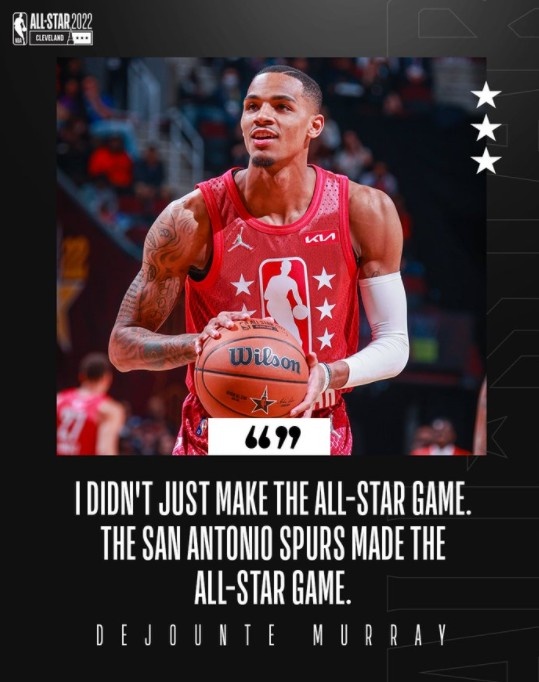 本次全明星是马刺球星德章泰-穆雷的首次全明星之旅。本赛季穆雷场均出战34.4分钟,砍下19.9分8.3篮板9.3助攻2抢断0.3封盖,投篮命中率45.9%,三分命中率31.9%,罚球命中率75.8%。