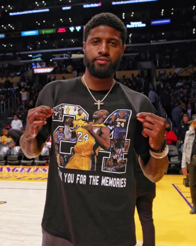 NBA官方晒出了快船球星保罗-乔治身着一件写着“谢谢你带来的回忆”的科比24号纪念T恤观战的照片,并配文道:“