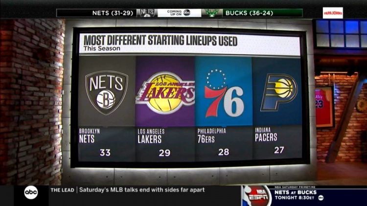 篮网今日赛后首发:欧文、赛斯-库里、布鲁斯-布朗、詹姆斯-约翰逊、德拉蒙德。这是他们本赛季第34套先发,排名联盟第一,湖人(29套)、76人(28套)和步行者(27套)分列二到四位。