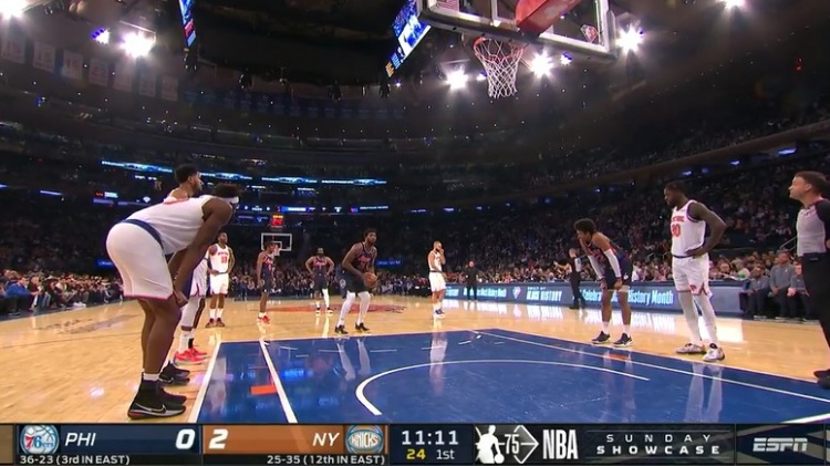 在比赛一开始的第一分钟,恩比德被犯规后执行罚球,尼克斯主场的球迷们齐声大喊“MVP!MVP!……”