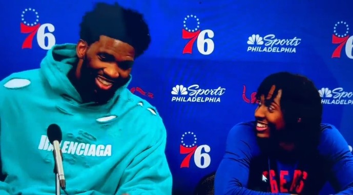 采访中两人的心情都很好,不断拿对方开玩笑。恩比德率先发难,当谈到自己在进攻24秒到点前将球传给马克西的原因时,他说道:“我看他喜欢这个,这就是我把球传给他的原因。”