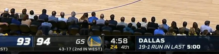 本场比赛第三节,勇士队最多领先21分,而第四节开始,独行侠替补阵容一波19-1,直接将分差迫近到了1分。