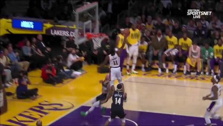 首节,威少失误后鹈鹕获得反击机会欲空接,蒙克飞身跃起拦截下来,并在出界前把球打到鹈鹕球员身上出界,为湖人队争得球权。
