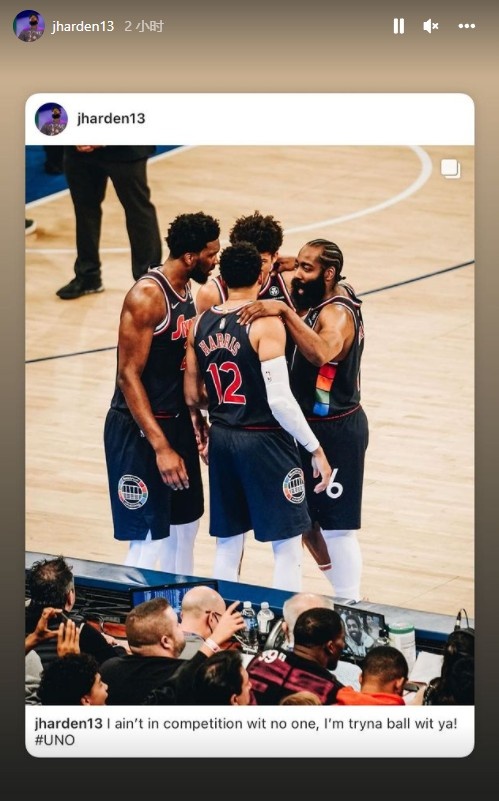 哈登配文写道:“我不是一个人在战斗,我在努力和你们所有人一起打球!”