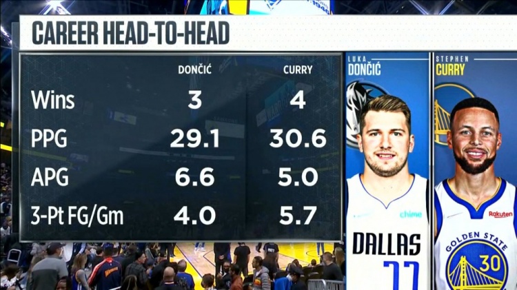 赛前,比赛画面给到了库里与东契奇两人的交手战绩:东契奇3胜4负,库里4胜3负。