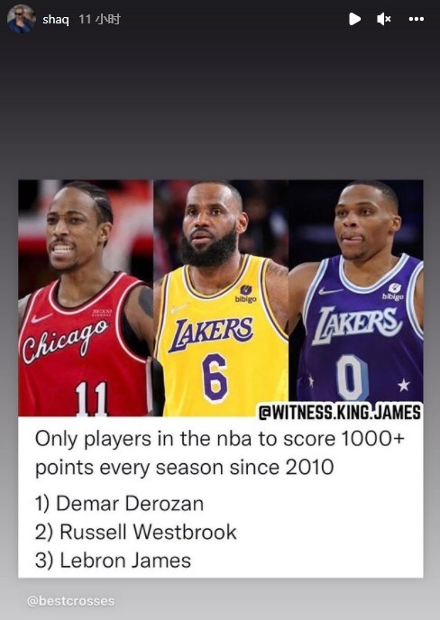 自2010年以来,只有三位球员能够在每个赛季都拿到1000分,他们分别是德罗赞、詹姆斯和威少。