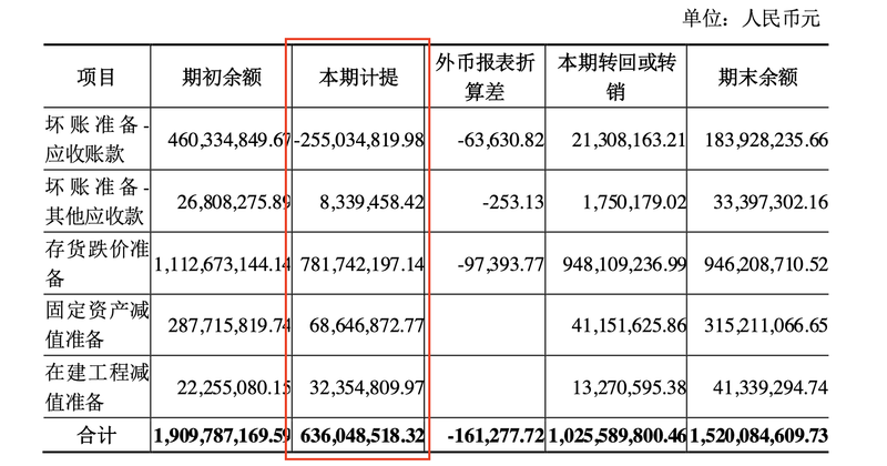 据此前公告显示,公司2021年累计计提各项减值准备约6.36亿元,其中主要为存货跌价准备,计提金额约7.82亿元。