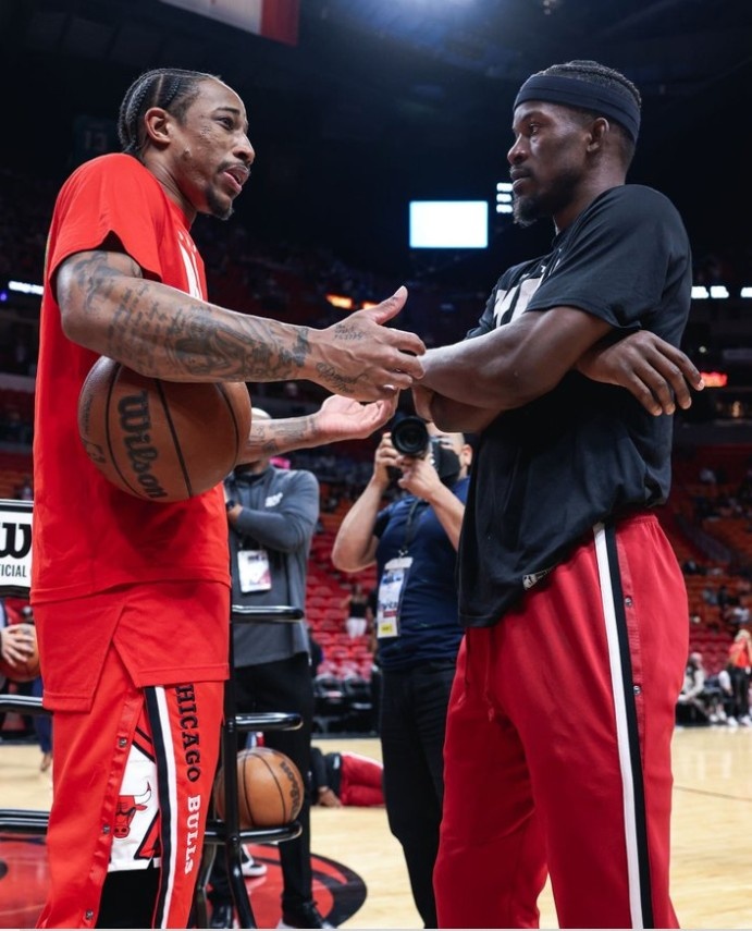 赛前公牛官方晒出球队核心德罗赞与热火球星巴特勒合照,配文写道:“东部的野兽。”