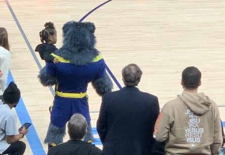 在比赛的过程中,灰熊的吉祥物充当了“保姆”,在场边抱起了莫兰特的女儿一起看球。