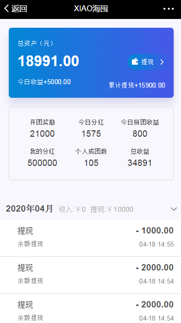 拼成200个团收益40000+终生永久加权分红。(加权分红是公司从卖产品的利润里边剥出来20%,公司是持续盈利的所以平台会非常稳健)