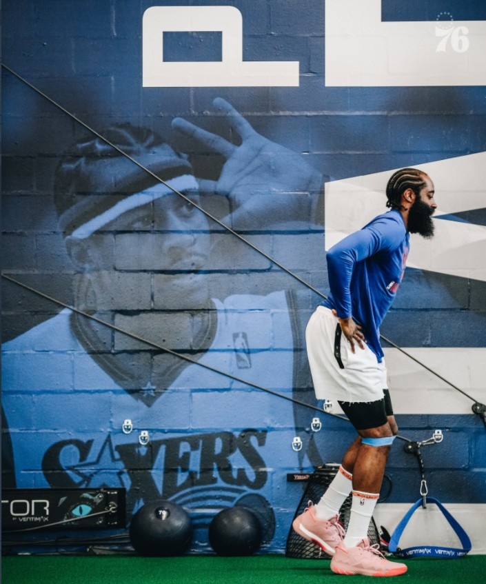 图中哈登表情非常专注,而背景墙中的艾弗森看起来十分醒目。