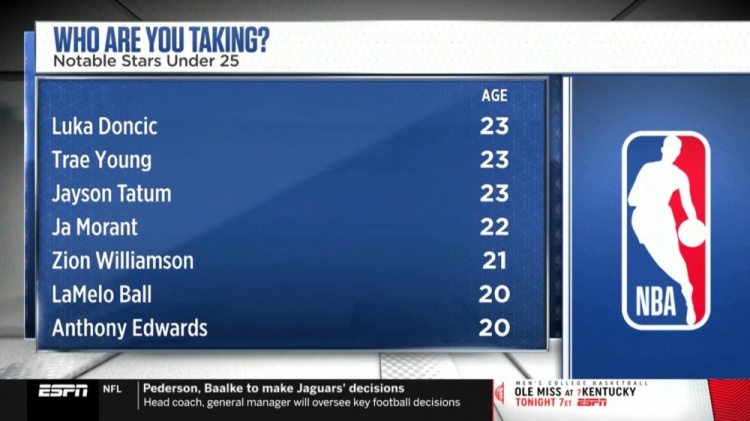 3月2日讯 今日,转播商晒出了一组25岁以下备受关注的球星:东契奇(23岁)、特雷-杨(23岁)、塔图姆(23岁)、莫兰特(22岁)、锡安(21岁)、拉梅洛-鲍尔(20岁)、安东尼-爱德华兹(20岁)。