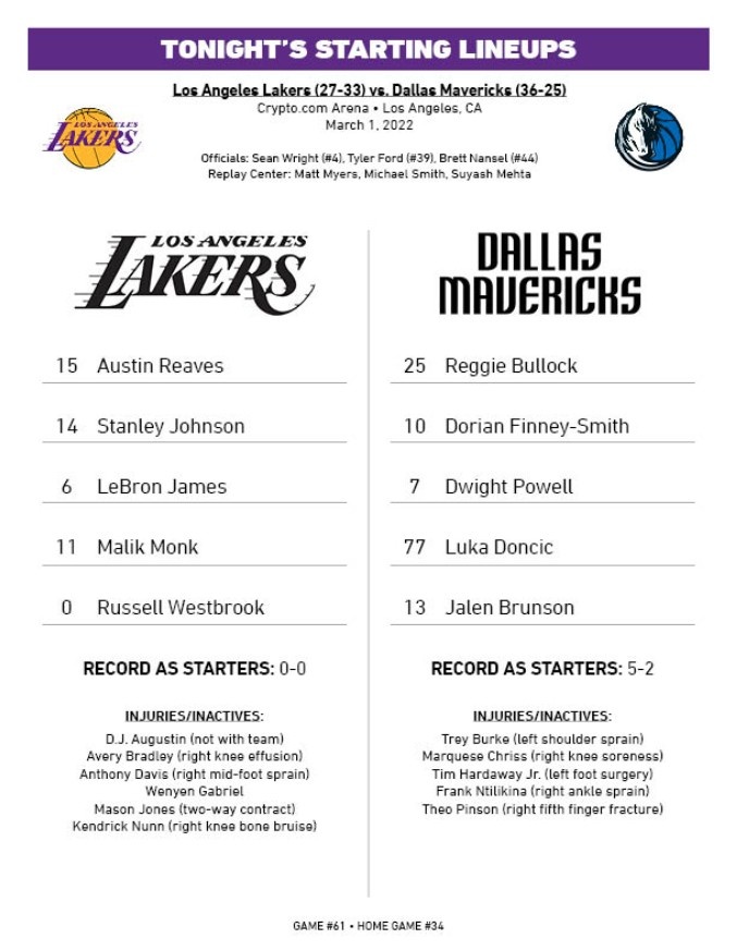 湖人首发:威少、里夫斯、蒙克、斯坦利-约翰逊、詹姆斯;