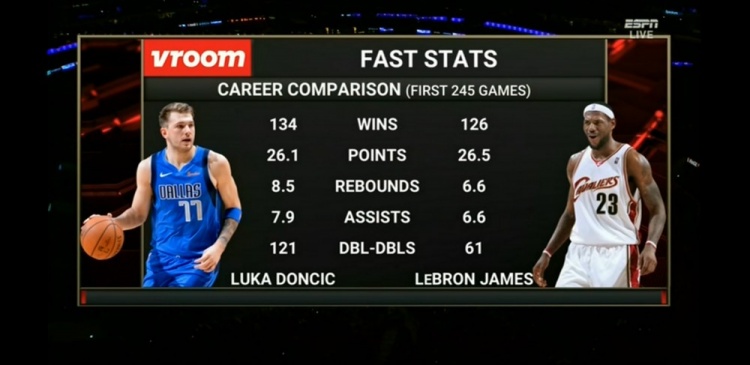 比赛暂停期间,直播画面给到了詹姆斯与东契奇生涯前245场常规赛(不算今天的比赛,东契奇生涯至今一共出战245场常规赛)的数据对比: